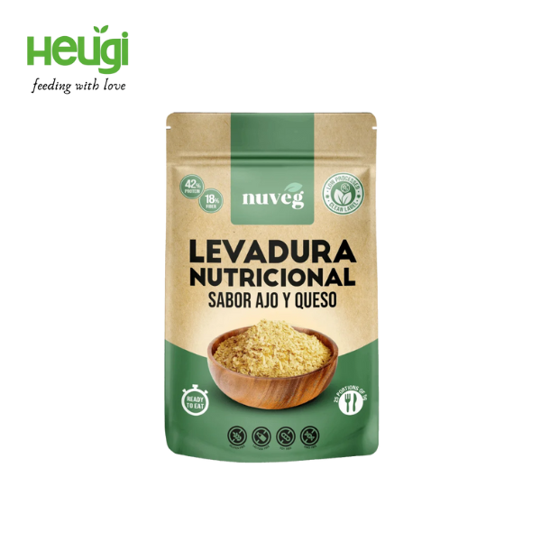 A Levedura Nutricional Nuveg para Alho e Queijo é uma fonte de proteína, fibra alimentar e vitaminas do complexo B. Pode ser consumida diretamente, usada em receitas ou polvilhada em alimentos e bebidas para obter mais nutrição e realçar o sabor do alho e do queijo. Uma porção típica é de 10 a 15 g .